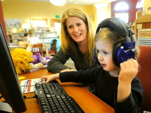 Abby Davis of Bangor gives her 3-year-old daughter, Elody, a lesson in technology while playing a children’s educational game at the Auburn Public Library on Wednesday. Davis was traveling to New Hampshire to visit family during the holidays. “We always stop at the library on our way to visit family,” she said.