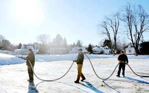 Alex Merchant, Dylan Guilmette and Ben Libby spray water as they build the ice rink at Walton Elementary School in Auburn on Thursday. The field has been transformed into a sheet of ice each winter for at least 20 years, said Merchant, who works for the Auburn Parks and Recreation Department. If temperatures stay cold enough, the free skating rink should be open by this weekend, he said.