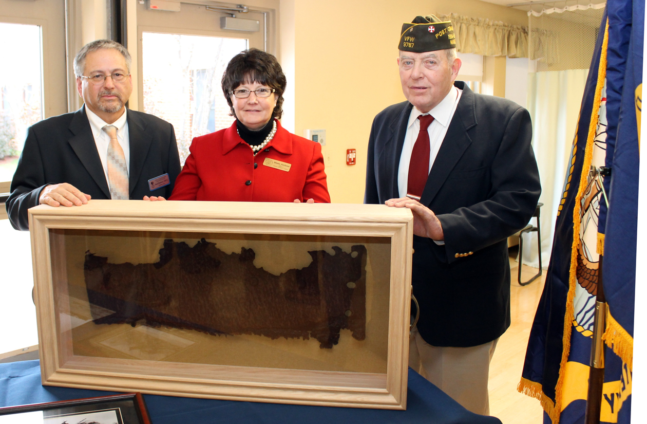 PARIS — In December the Maine Veterans’ Home in South Paris hosted a special Pearl Harbor Remembrance Day event, the unveiling of a piece of the USS Arizona that sank 71 years earlier. Of the more than 2,500 service members killed during the Japanese attack, almost half died aboard the Arizona. MVH and the Western Maine Veterans’ Advisory Committee, with the support of Sen. Olympia Snowe’s office, worked to obtain a small piece of steel, measuring about 30 inches long and 12 inches wide.