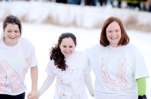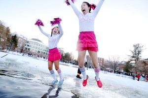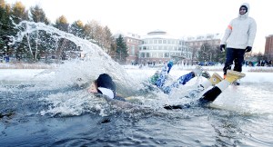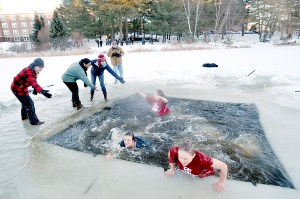 Becky Culp, right, and Kara McGowan leap into a hole through the ice on Lake Andrews during the annual Puddle Jump at Bates College in Lewiston on Friday. The Bates Outing Club organizes and provides safety for the annual event, which is held during the weeklong Winter Carnival. At least one professor, Nancy Koven, joined hundreds of students who made the plunge. The jump has been a tradition for more than 30 years.