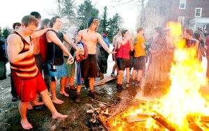Bates College students warm up by a fire after jumping into a hole in the ice on Lake Andrews.