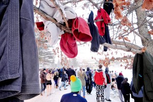 Student clothes hang in a tree on the side of Lake Andrews.