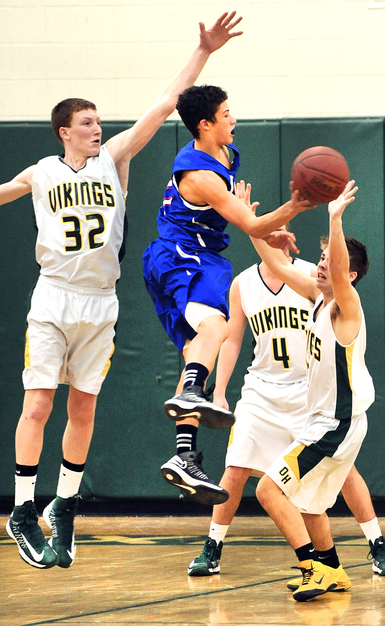 Oxford Hills’ Andrew Fleming, left and Matt Beauchesne team up to force Mt. Ararat’s Sycheim Ulrickson to make a bad pass that was stolen by the Vikings during Monday afternoon’s game.