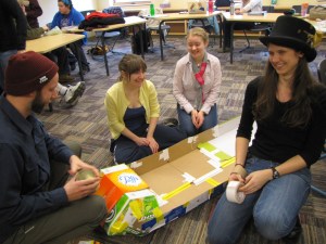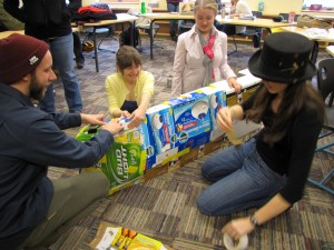 In past years, a refrigerator door and sleeping bags were used in the contest. Cardboard and duct tape often are used. So are recyclable packaging materials and duct tape.