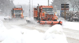 A pair of Auburn snowplows clear the Union Street Bypass in Auburn on Monday afternoon just before the snow turned to rain.