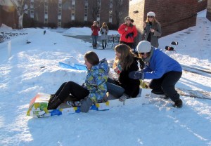 University of Maine at Farmington students Kelsey Ottman and Liz Dunn get a push Sunday as they attempt another run down the hill at the amphitheatre on campus in a sled made of sustainable materials. The event, sponsored by student members of the Sustainable Campus Coalition at UMF, awarded prizes for the best recyclable, most compact, the fastest sled and most creative idea of recycling materials for a sled.