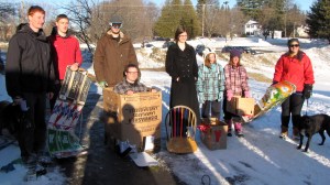 A variety of student-designed cardboard sleds and other unique vehicles competed Sunday as student members of the Sustainable Campus Coalition at the University of Maine at Farmington sponsored a recyclable sled race at the amphitheatre on campus. Pictured are some participants with sleds made of cardboard taped to a snowboard, sleds of flattened cardboard, the most compact — the smallest boxes — and half a chair re-used as a sled seat.
