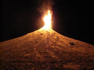 When the logs are lit through a tunnel at the base, flames and sparks will shoot out the top high into the air, creating the effect of a volcano, Seymour Perkins said.