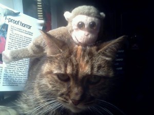 Do you ever help him write? Baby again. I help him write all the time, mainly by walking across his keyboard when he’s trying to sort out a complex plot point. Sometimes I just stand on the return key to give him a mile of white space between sentences. Makes me laugh like hell. But I do help. The chilling end to “The Pink Room” was all mine, for instance. Mark wanted to end it with “and then he woke up and it was all a dream” or something insipid like that. So I took a stroll across the keyboard and gave him a more suitable ending. He liked it, kept it and claims it was his own idea. I’m OK with that.