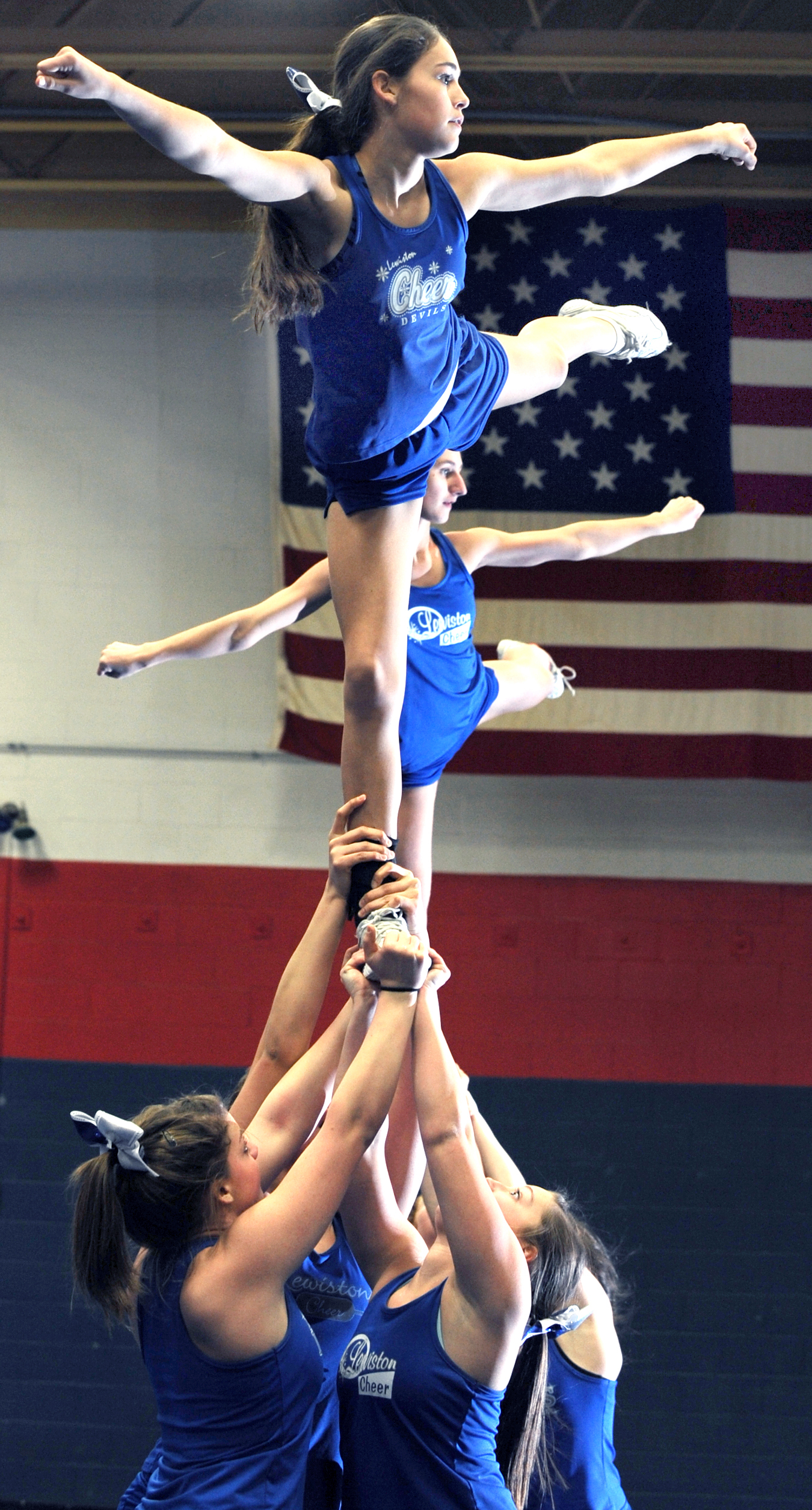 Lewiston cheerleaders meet for summer workouts in June and attend a team camp in July. During autumn they rehearse many of their stunts while cheering at football and soccer games.
