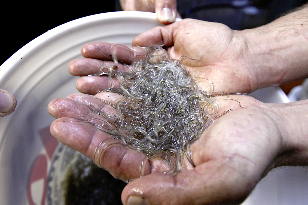 Baby eels swim up Maine rivers each spring and are caught by hundreds of net-wielding fishermen during the 10-week season. Most of the catch is shipped to Asia, where the eels are raised in farm ponds to market size.