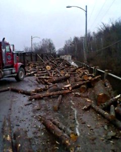 The load of logs spilled across the bridge and another 15 to 20 logs fell into the canal off the Androscoggin River.