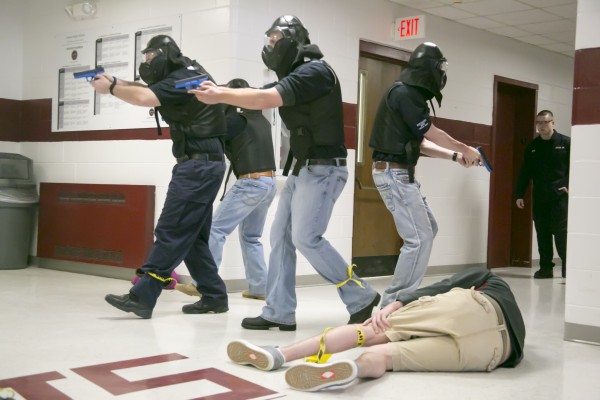 The drills were planned well in advance of the Boston Marathon bombings and the fast-paced police investigation that followed. Wilcox said the week’s events served to bring home the importance of this emergency training to the futures of these students.