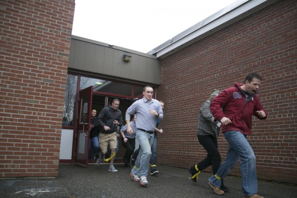 Around 10 a.m., the first shots rang out in the school’s lobby. The fire alarm blared moments later. Husson students laid on the ground in the lobby and hallways, tagged with Post-it notes listing their invented injuries and heart rates. Other students hid away in classrooms as the “lockdown” announcement aired over the loudspeakers.