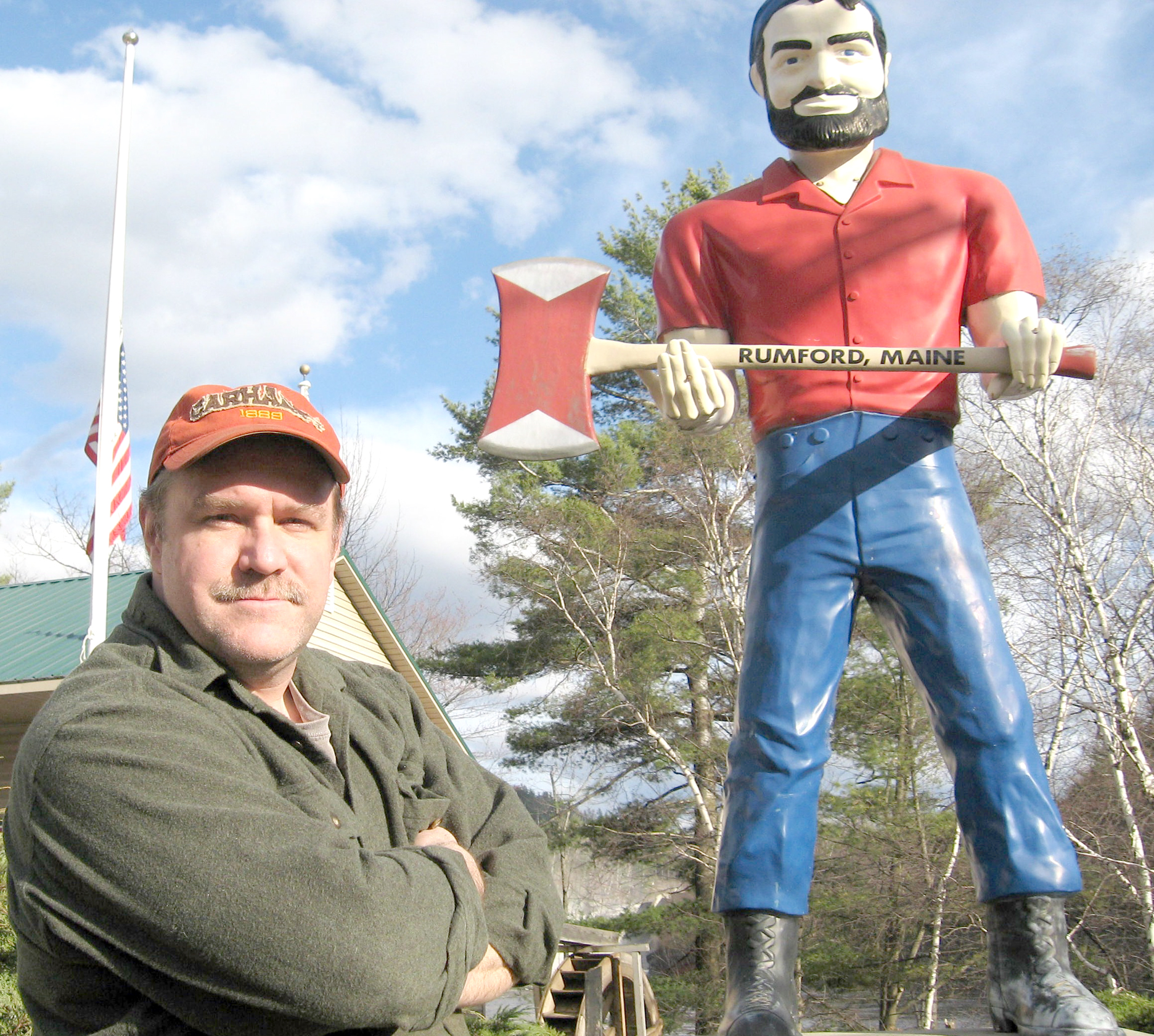 Greg Viger photo Scot Grassette, promoter of the Tall Tales contest at 49 Franklin, poses by Rumford’s iconic Paul Bunyan statue.