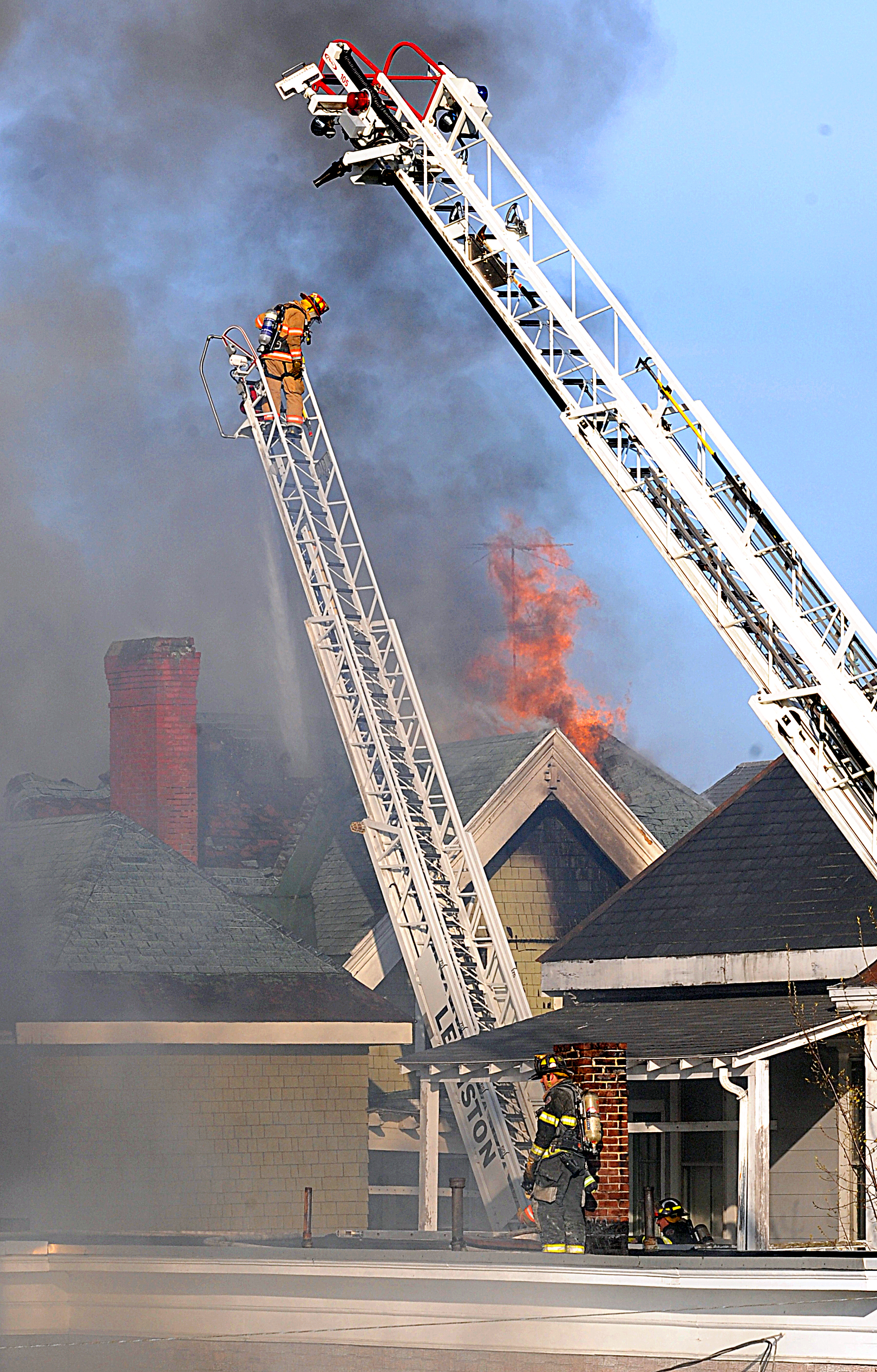 Within minutes, the fire jumped to the back of 172 Bates St., and onto nearby lawns. According to firefighters, the roof at 82 Pine St. caught fire just after 5 p.m., and smoke rolled out of the third floor minutes later, with the fire quickly spreading through the building.