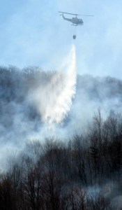 The three Maine Fire Service helicopters dumped water pumped from a farm pond on nearby Cushman Road.