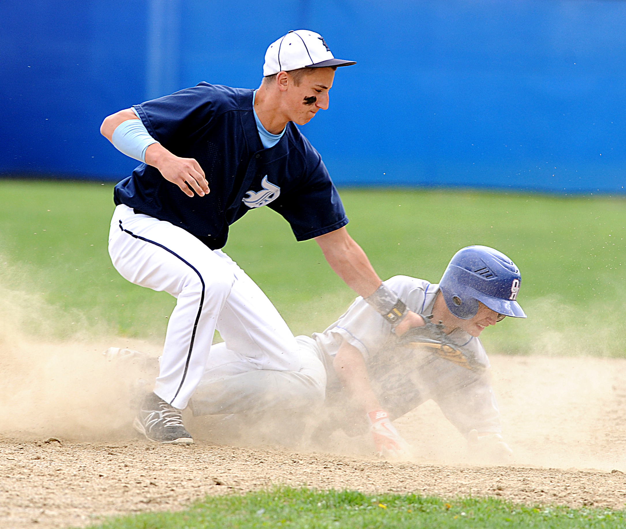 Oak Hill’s Dalton Burns attempts a double play as Dirigo’s Kaine Hutchins slides out at second Thursday in Wales. The runner was safe at first on an error.
