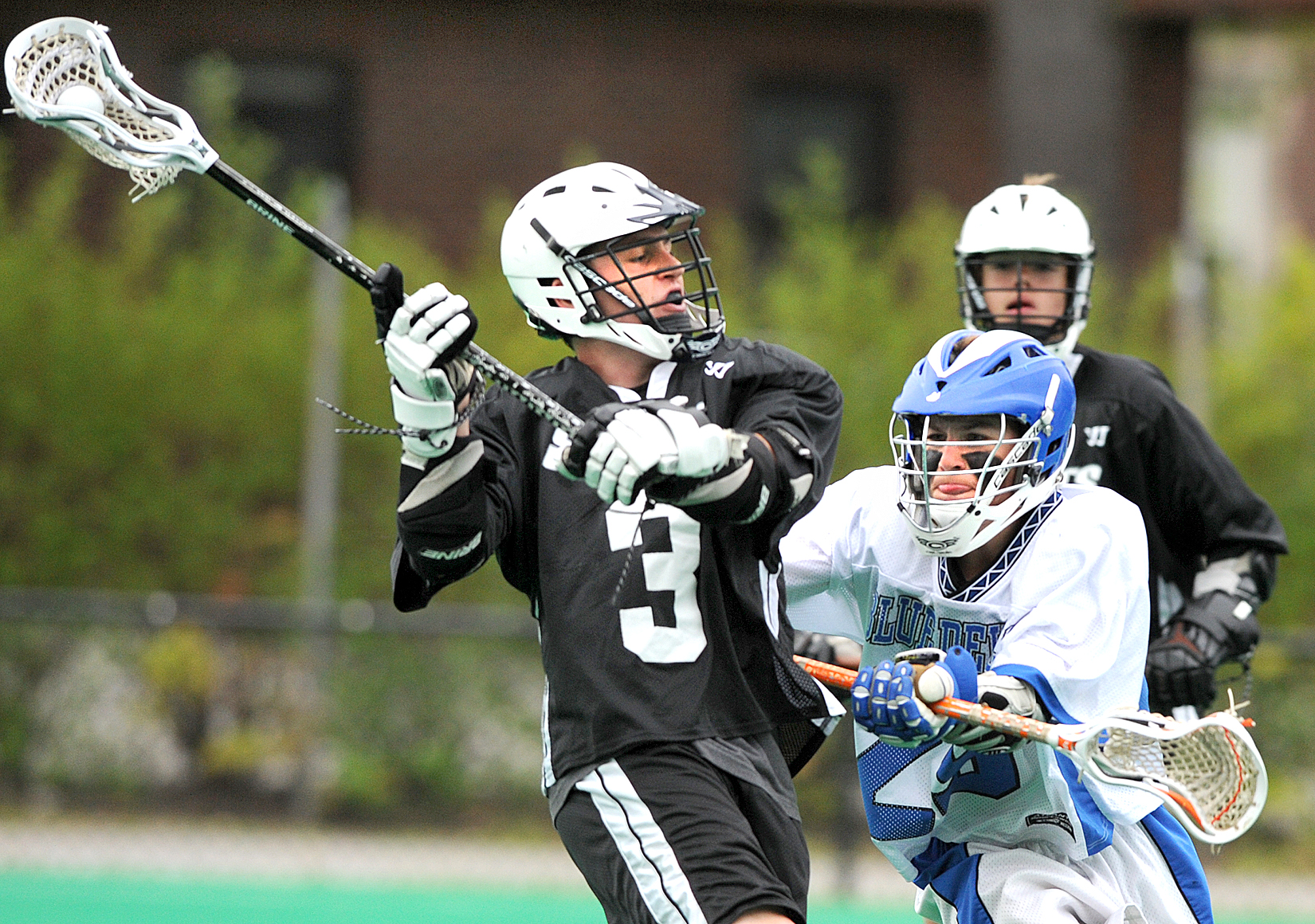 Lewiston’s Griffin Wade, right, checks Dalton Lorenz of Saint Dominic Academy as he releases a shot during Wednesday afternoon’s larcosse game at Bates College in Lewiston.