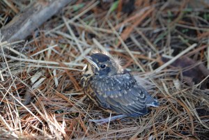 This baby robin discovers the ground for the first time Monday in a Livermore Falls yard. A baby robin made its first flight to the ground from its nest in a tree Monday in a Livermore Falls yard.