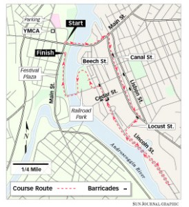 The flat, fast race course, which is USA Track & Field certified, will take runners across Longley Bridge into Lewiston, right onto Canal Street, right onto Locust Street, left onto Lincoln Street to a turnaround. It will return to Lincoln Street, turning left into Simard/Payne Memorial Park, right along the Riverwalk and will finish at Festival Plaza.