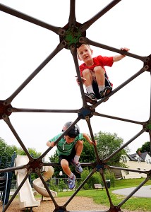 Brothers Simon Bolduc, 6, right, and Nelson Bolduc, 5, of Auburn play on the eagle’s nest behind Walton School in Auburn on Monday afternoon. The two were enjoying the day with their dad, Glen.