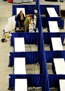 Karen Mayo, left, from Community Little Theater, and Odelle Bowman from L/A Arts set up the booth for a new organization called Arts and Culture Lewiston-Auburn on Wednesday inside the Androscoggin Bank Colisee in Lewiston in preparation for the Business to Business Trade Show. The trade show is Thursday from 9:30 a.m. to 5:30 p.m. and is free with a business card.