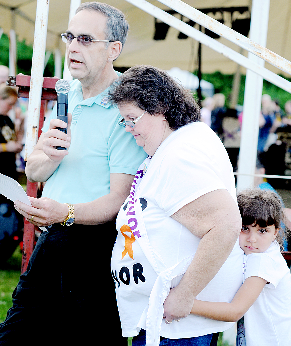 Dan Corriveau of Auburn tells his wife Cindy Corriveau’s survivor story during opening ceremonies on Friday evening. Cindy Corriveau’s 6-year-old care giver Emma Meserve of Auburn is at right.