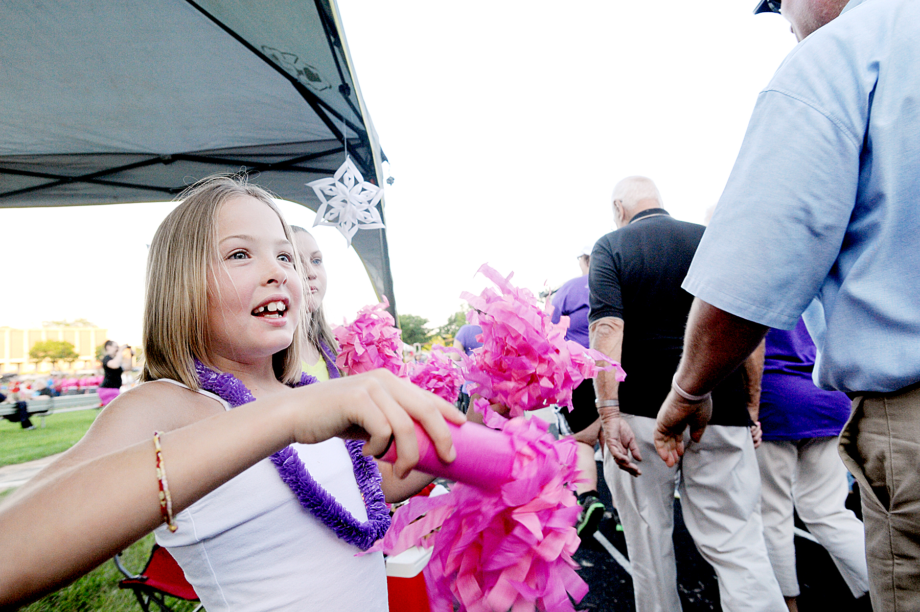 Morghan Dutil, 9, of Turner cheers during the survivor lap on Friday. Dutil, along with family and friends, attended the Relay for Life in memory of her grandmother, Sandy Dutil, and to support Auburn teacher DeeDee Stearns.