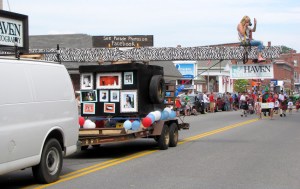 Holly Kangas of Haven Photography in Farmington takes photos from a bar atop her float in the Fourth of July parade in Farmington on Thursday. The bar swung from one side of the street to the other, giving her an opportunity to take pictures of the crowds.