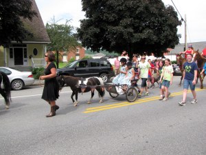 Cindy Willingham of Farmington leads the Giddy-Up & Go 4-H Horse Club, also of Farmington, in the Fourth of July parade in town on Thursday. Her daughters, Mia and Grace, ride in the cart pulled by a miniature horse as club members march behind them.
