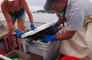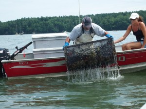 After reaching the end of the rope, he leaned over the side of the boat and plunged his hands into the water, grabbing hold of a black metal trap. In what appeared to be a delicate balance, Goodenow heaved the trap into the small boat, positioned it above a gray rectangular storage container, and flipped open the latch at the bottom.