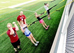 Mike Milliken, left, and Mike Seltzer, third from left, coach participants in exercises during “Functional Fitness” at Bates College on Monday morning. Milliken, wellness coordinator for the Bates B Well Program, and Seltzer of Accelerated Performance offer the one-hour workout at the football stadium at 6:30 a.m. on Mondays and Wednesdays. The workouts vary from day to day and are designed to strengthen the whole body, according to Seltzer of Lewiston. Each session is open to the public and costs $10 each. Call Milliken at 753-6936 or email him at [email protected] for more information. From left are: Milliken, Leanne Waterman of Gray, Seltzer, Melinda Bedard of New Gloucester and Bedard’s husband, Andy.