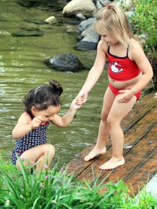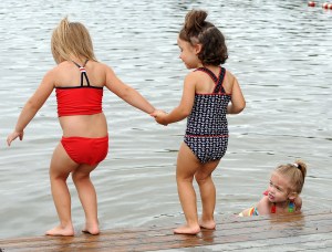 Sophia Borkowski, 3, of Litchfield, helps Amelia Scalia, 2, up onto the ramp at Monmouth Center Beach on Cochnewagon Lake on Monday morning. The two were having fun splashing around prior to the start of their swim lesson.