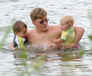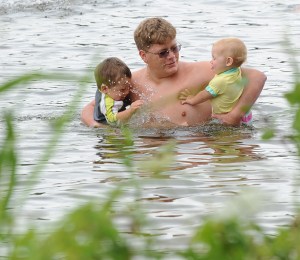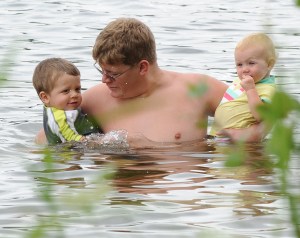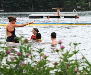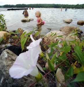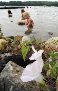 Morning glories greet young swimmers as they explore close to the shore Monday morning at Monmouth Center Beach on Cochnewagon Lake.
