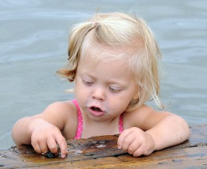 Seeking inspiration from more experienced swimmers, a little girl communes with nature during swim lessons at Monmouth Center Beach Monday morning.
