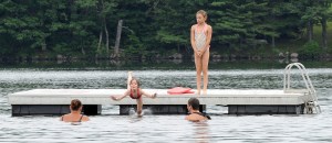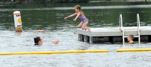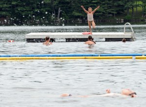 Swimmers jump from a float on Cochnewagon Lake at Monmouth Center Beach Monday morning as part of swim lessons.