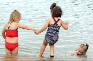 Little ones take their first splashing steps toward swimming at Monmouth Center Beach on Monday morning.