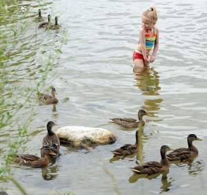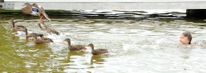 A young swimmer scares a group of mallards while splashing at Monmouth Center Beach on Monday.