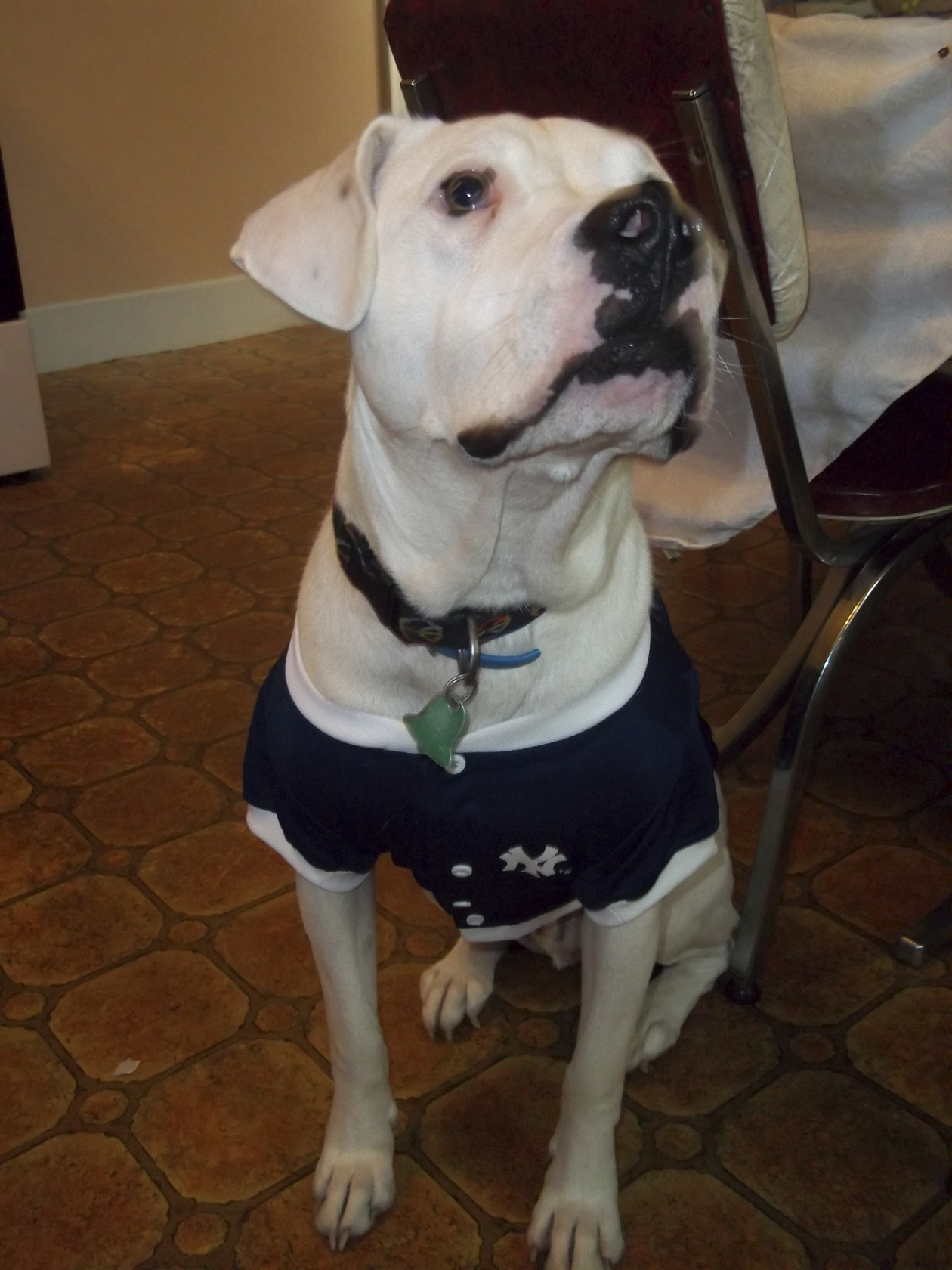 Libby Roy’s bulloxer (American bulldog and boxer hybrid), who wears a Yankees jersey, is “Mugzy.”