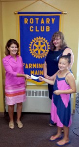 Tracy Williams, principal of the W.G. Mallet School, Farmington, accepts a donation for the school’s library from Ellie Marshall of Early Act and Catlin Pease from Interact, two Farmington Rotary sponsored youth clubs, during a recent Rotary Club meeting. Marshall and Pease raised the money at a bake sale during the Rotary’s 4th of July Parade. Franklin Savings Bank matched their efforts, enabling them to make donations of $150 each to three local school libraries, W.G.Mallett, Cape Cod Hill, and Academy Hill School.