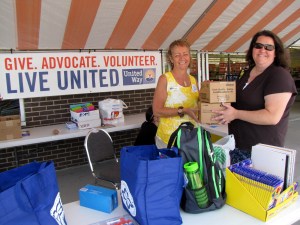 Christine Tropeano, left, and Keli McLellan, volunteers for United Way of the Tri-Valley Area, organize items to fill school backpacks Friday afternoon outside BigLots! on routes 2 and 4 in Farmington. Volunteers from BigLots!, the United Way, the Farmington Rotary Club and the community filled more than 150 backpacks with donated items.