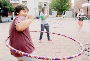 Jodi Lucas of Auburn spins a hula hoop at Dufresne Plaza in Lewiston on Thursday evening.