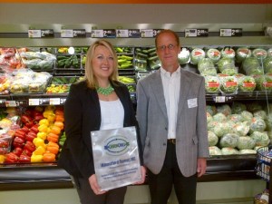 The new Hannaford store in Turner was recognized Wednesday for its first-in-the-nation cooling and freezing system. Above, Tom Land, who manages the GreenChill Partnership at the U.S. Environmental Protection Agency, presented GreenChill platinum certification to Kim Kuusela, manager of the Turner Hannaford Supermarket & Pharmacy. The certification, one of only two in the country, recognizes the store’s use of an advanced refrigeration system that is far better for the environment than conventional systems. The store is the first supermarket in the country to cool and freeze food with a system that uses only carbon dioxide as a refrigerant. Traditional refrigeration technologies are prone to refrigerant leaks that both deplete the ozone layer and contribute to climate change. Hannaford opened the 35,000-square-foot store on July 20. Similar CO2 refrigeration units have been employed in northern Europe and Canada.