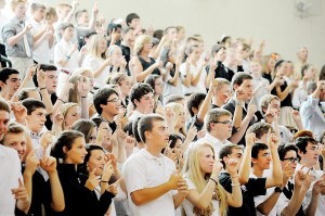 Students sing “Our God is an Awesome God” during the opening of the school year Mass at Saint Dominic Academy in Auburn on Friday.