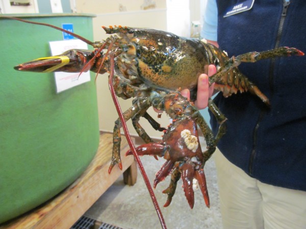 Colored lobsters are thought to be at a disadvantage at the bottom of the ocean because their bright colors single them out for predators. Whether Lola was at a disadvantage because of her mutated claw seems in doubt. Hayden-Roderiques and Libby estimate she’s about 10 years old. Whether her misshapen claw will survive Lola’s next molt remains to be seen.