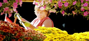 Melissa Clark waters fall mums at her business on Route 4 in Turner on Thursday. Clark, the owner of Clark’s Farm, said mums have been coming in over the past two weeks.