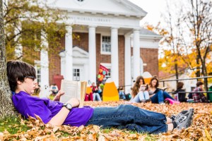 Small groups of students took up positions stretched out on the lawn, leaning up against the library’s front colonnades or under a pile of fallen leaves to enjoy a little quiet reading time.