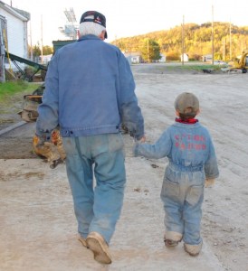 Each morning of harvest, Kris helped his young son get into his special famer coveralls to begin the day.