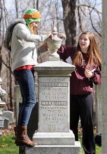 While some students hauled tarps filled with leaves down to the woods, Grant and freshmen Jordhan Coward, Kelsea Blanton and Rebecca Bero dug a trench around Swett’s headstone to make lifting the large marble stone easier.
